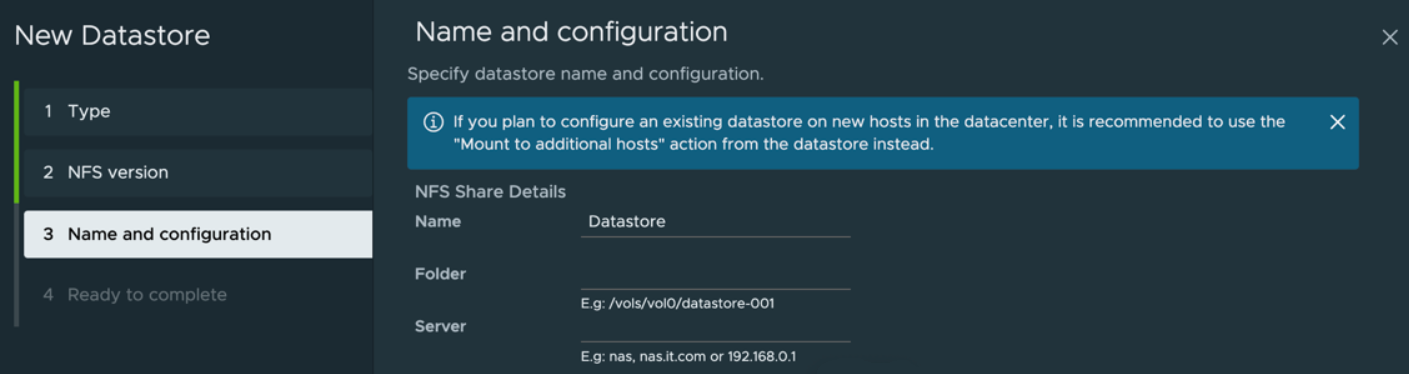 Using correct the folder path syntax by including a forward slash at the beginning of the path when configuring the NFS datastore mount.