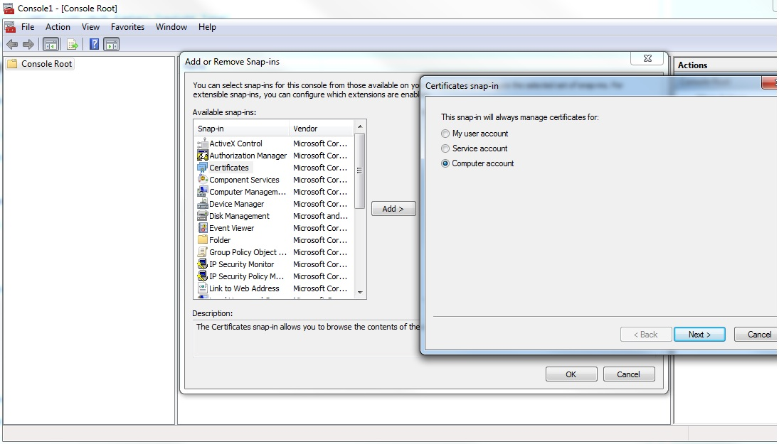 iv. Select Computer account and then proceed to import the certificate in the trusted root store.