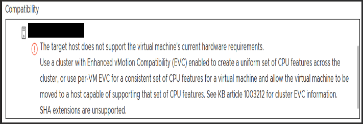 To work around the The target host does not support the virtual machine's current hardware requirements error when EVC cannot be enabled, perform a powered-off cold migration of the virtual machine.