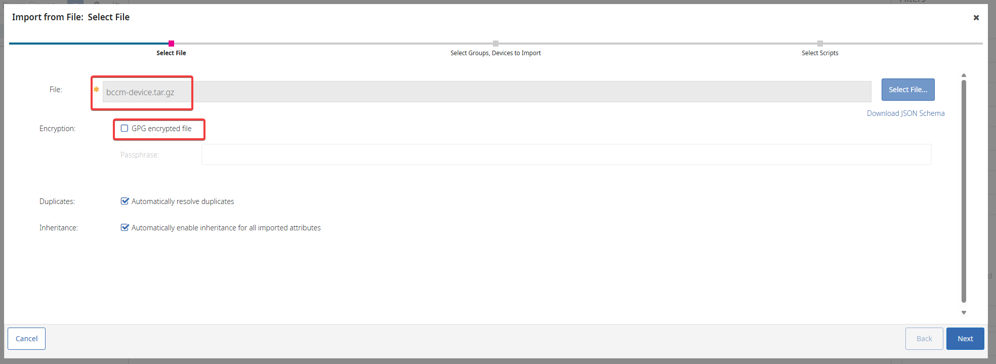 2. Disable GPG encryption and select JSON file, note it must be nested in a GZIPed TAR container (.tar.gz):