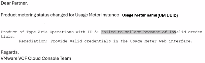 Aria Operations is integrated to Usage Meter with it's local 'admin' account. To resolve this issue, ensure admin account on Aria Operations is not locked and you can login to Aria Operations UI with admin account.