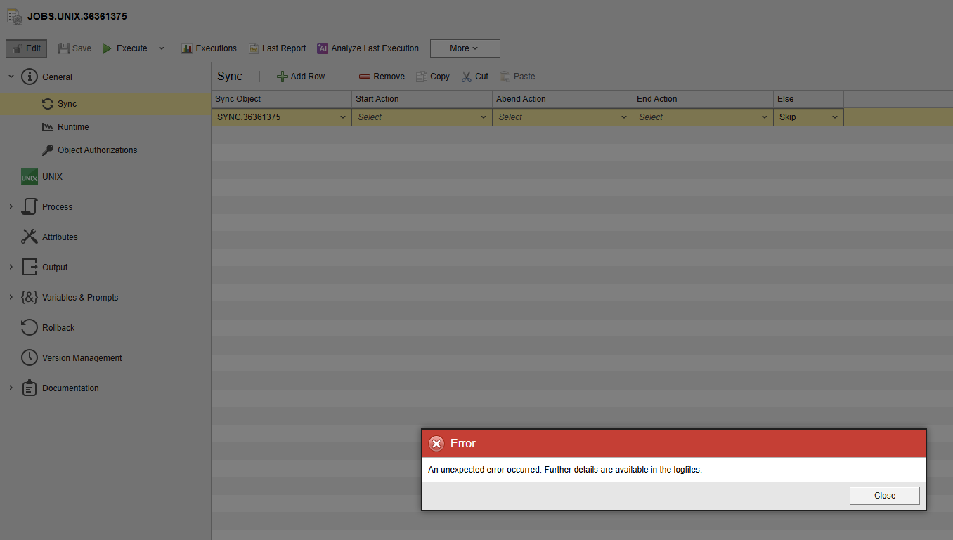 Clicking on a sync action (start action, abend action, end action), e.g., inside a job under General --> Sync, and the sync object does not exist in the client, creates an error: An unexpected error occurred. Further details are available in the logfiles.