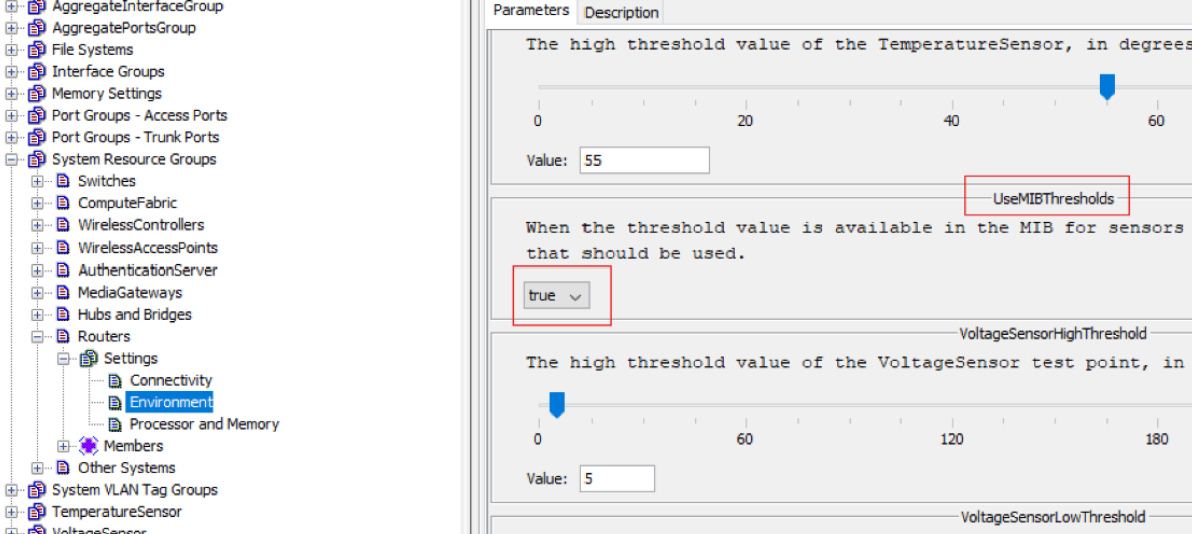 You can set your own threshold value, and disable the MIB value of a vendors device by setting UseMIBThresholds to false in Thresholds --> System Resource Groups --> <respective group> --> Environment followed by reconfigure.