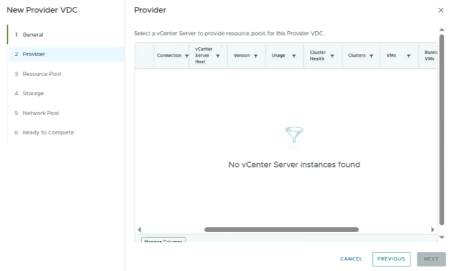Unable create New Provider vDC as the registered vCenter is not listed.
