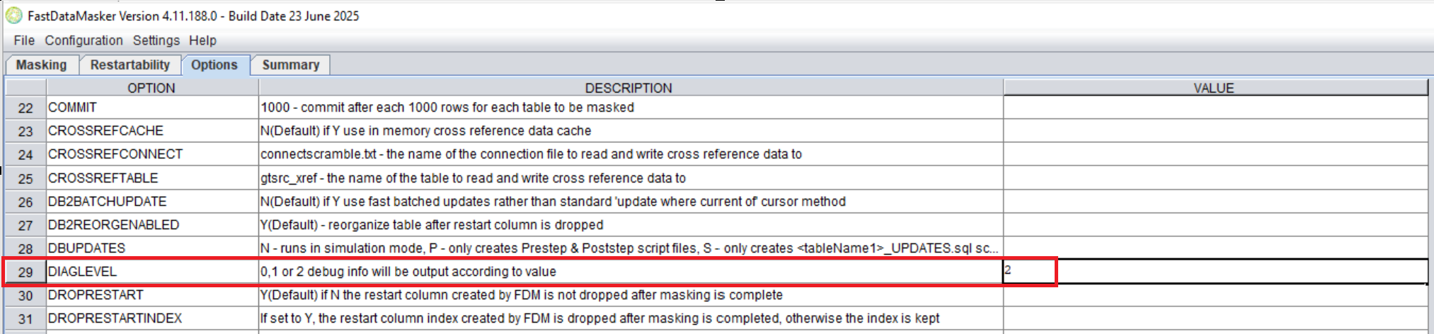 The masking option DIAGLEVEL is used to set the level of diagnostics to be logged during a masking job. The possible values are 0 - 5, where 0 disables logging (no diagnostics) and 5 being the deepest level of diagnostics. The default level of diagnostics is 1, where general information is logged, along with any errors recorded.
