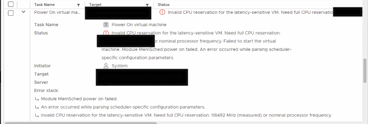 We need to configure full CPU and Memory reservation to allow VM to Power ON.