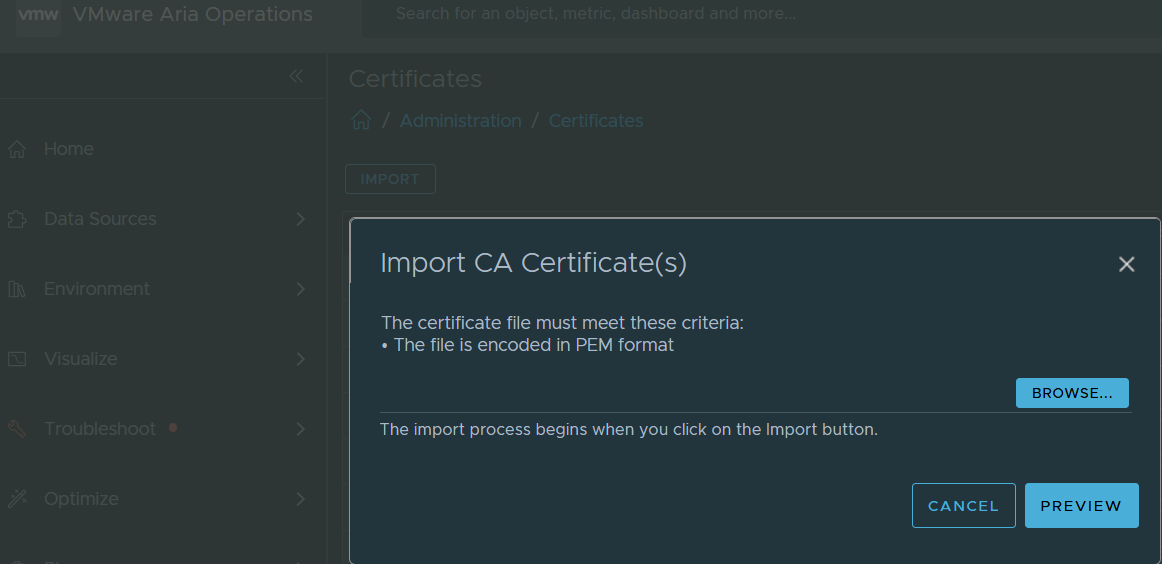 Navigate to Administration > Certificates > Import, then browse to select the PEM file and click Save