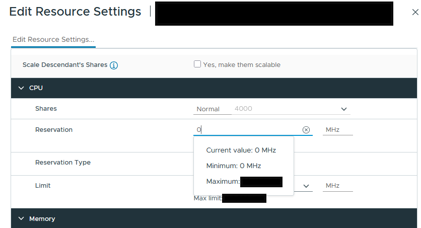 Click Reservation under CPU section, verify the maximum allowed reservation value example: 900 GHz