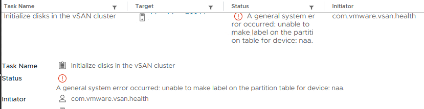 A general system error occurred: unable to make label on the partition table for device: naa.5000########