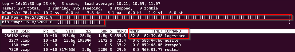 # bosh ssh -d appMetrics-<DEPLOYMENT_ID> ssh log-store-vms/<INSTANCE_ID># sudo su# monit summary# monit status ----------> view the log-store process for uptime to see when it last restartedtop command to view memory from a bosh ssh to the log-store-vm shows that the log-store process is consuming memory, this might show memory swapping depending on how degraded the VM is./var/log/kern.log will report oom_reaper warnings like:Out of memory: Killed process <ID> (log-store)oom_reaper: reaped process <ID> (log-store) This problem was seen on the Metric Store 1.7.0 for App metrics version 2.3.0-build.4. The problem relates to the underlying influxdb and is not necessarily version dependent.