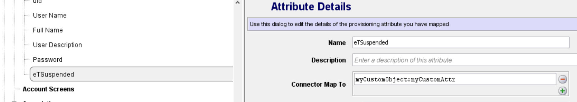 3. Create a new attribute and map it to myCustomObject:myCustomAttr. In the example below "eTSuspended" is used as the name of the attribute, but it is not important and you can call it the way you like: