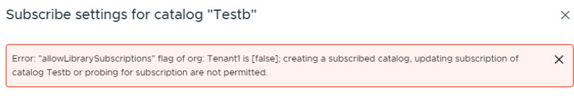 The issue occurs because the allowLibrarySubscriptions flag for the organization is set to false. This flag controls whether the organization is allowed to subscribe to external catalogs.