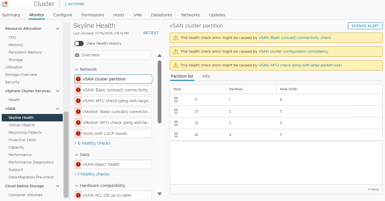 After recovering from a power outage, the hosts are in a vSAN Cluster Partition