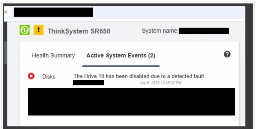 Jul 06 18:45:52 1751841952 xx.xx.xx.xx .1.3.6.1.4.1.19046.11.1.158.5 .1.3.6.1.4.1.19046.11.1.158.5.0.5 6 5 Sun Jul 6 22:45:37 2025 xxxxxxxx DE9BB1B638D111Exxxxxxx xxxxxx 164 Critical - Hard Disk drive 0 The Drive 10 has been disabled due to a detected fault. Not available Not available 0 Not available 806f0xxxxx serviceableByLenovo(1) false(0) Not available xxxxx WW Not available xxxxxx 0 XCC