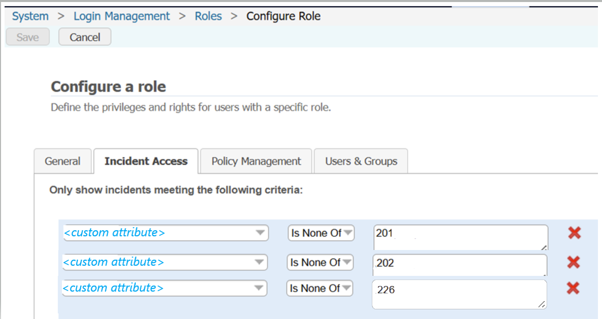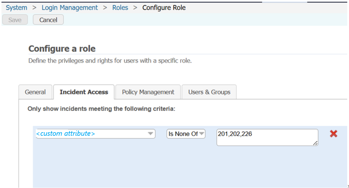 In the incident access rule created for the role, you create a rule based on a custom attribute and specify multiple values of the attribute, separated by commas.