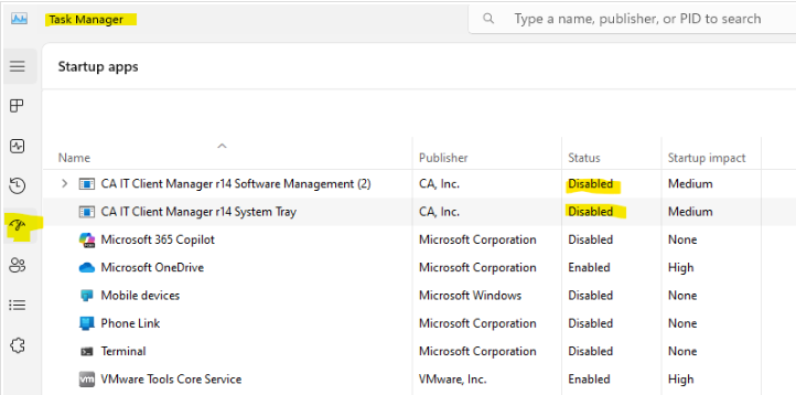 In Windows Task Manager in Startup Apps tab, "CA IT Client Manager r14 Software Management" and/or "CA IT Client Manager r14 System Tray" are disabled :