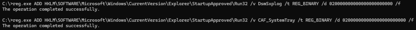 reg.exe ADD HKLM\SOFTWARE\Microsoft\Windows\CurrentVersion\Explorer\StartupApproved\Run32 /v DsmSxplog /t REG_BINARY /d 020000000000000000000000 /f