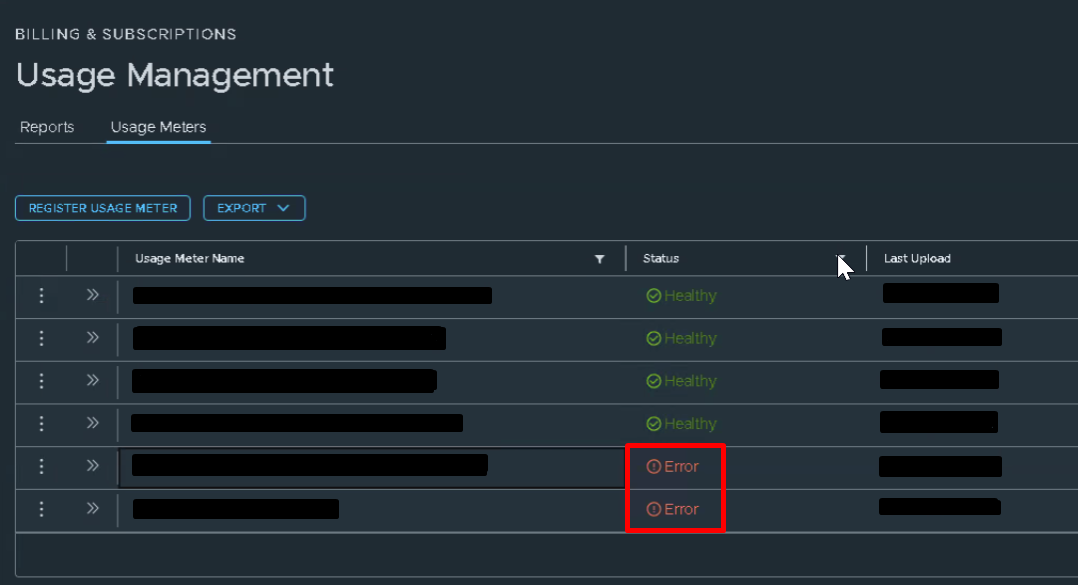 After upgrading the Usage Meter appliance from version 4.x to 9.x, the Usage Meter appears in an error state within the Broadcom Service Portal.