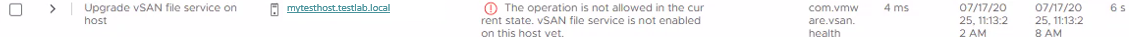 After enabling vSAN File Services, the file services VM's have deployed initially, but you see that one or more of the "Upgrade vSAN file service tasks" for the File Services VM's (FSVM's) fails with " "The operation is not allowed in the current state. vSAN File Service is not enabled on this host yet":