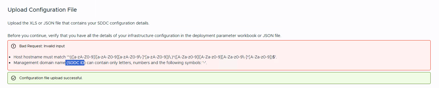 YYYY-MM-DDTHH:MM:SS+0000 [bringup,687e40eb5d9ef8734547b5a87dfd4e15,c307] INFO [c.v.v.b.c.v1.BringupPublicController,http-nio-0.0.0.0-9080-exec-5] Getting and sorting all validation statuses by creation time.YYYY-MM-DDTHH:MM:SS+0000 [bringup,687e413aa76b2c0e0cadc347b6223b57,429f] INFO [c.v.v.b.c.v1.BringupPublicController,http-nio-0.0.0.0-9080-exec-7] Upload SDDC Spec File for Bringup: spec file il0h-vcf-deploy.jsonYYYY-MM-DDTHH:MM:SS+0000 [bringup,687e413aa76b2c0e0cadc347b6223b57,429f] INFO [c.v.e.s.b.a.r.j.i.JsonGeneratorUtilImpl,http-nio-0.0.0.0-9080-exec-7] il0h-vcf-deploy.json is not Excel fileYYYY-MM-DDTHH:MM:SS+0000 [bringup,687e413c9083c82f173f7c6de9bd924f,10a0] ERROR [c.v.e.s.c.v.i.LocalizableAnnotationValidationUtil,http-nio-0.0.0.0-9080-exec-8] Spec violation SDDC_HOST_HOSTNAME_PATTERN_INVALIDYYYY-MM-DDTHH:MM:SS+0000 [bringup,687e413c9083c82f173f7c6de9bd924f,10a0] ERROR [c.v.e.s.c.v.i.LocalizableAnnotationValidationUtil,http-nio-0.0.0.0-9080-exec-8] Spec violation SDDC_HOST_HOSTNAME_PATTERN_INVALIDYYYY-MM-DDTHH:MM:SS+0000 [bringup,687e413c9083c82f173f7c6de9bd924f,10a0] ERROR [c.v.e.s.c.v.i.LocalizableAnnotationValidationUtil,http-nio-0.0.0.0-9080-exec-8] Spec violation SDDC_HOST_HOSTNAME_PATTERN_INVALIDYYYY-MM-DDTHH:MM:SS+0000 [bringup,687e413c9083c82f173f7c6de9bd924f,10a0] ERROR [c.v.e.s.c.v.i.LocalizableAnnotationValidationUtil,http-nio-0.0.0.0-9080-exec-8] Spec violation SDDC_ID_PATTERN_INVALIDYYYY-MM-DDTHH:MM:SS+0000 [bringup,687e413c9083c82f173f7c6de9bd924f,10a0] ERROR [c.v.e.s.c.v.i.LocalizableAnnotationValidationUtil,http-nio-0.0.0.0-9080-exec-8] Spec violation SDDC_HOST_HOSTNAME_PATTERN_INVALIDYYYY-MM-DDTHH:MM:SS+0000 [bringup,687e413c9083c82f173f7c6de9bd924f,10a0] ERROR [c.v.e.s.e.h.LocalizableRuntimeExceptionHandler,http-nio-0.0.0.0-9080-exec-8] [QQ82O9] REST_INVALID_API_INPUT Invalid input com.vmware.evo.sddc.common.core.error.CompositeInvalidInputException: Invalid input