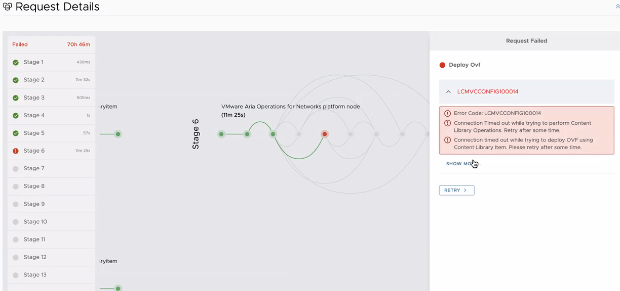 /var/log/vrlcm/vmware_vrlcm.log2025-07-21T03:58:08.243Z ERROR vrlcm[1179] [pool-3-thread-43] [c.v.v.l.c.v.c.DeployOvfTask] -- Connection timed out while trying to deploy OVF using Content Library Item. Please retry after some time. Error : java.net.SocketTimeoutException: Connection Timed out. at com.vmware.vrealize.lcm.drivers.vsphere65Plus.VcCollectionImpl.mapAndThrowExceptions(VcCollectionImpl.java:494) ~[vmlcm-vsphereplugin65Plus-driver-8.18.0-SNAPSHOT.jar!/:?] at com.vmware.vrealize.lcm.drivers.vsphere65Plus.VcCollectionImpl.invokePost(VcCollectionImpl.java:214) ~[vmlcm-vsphereplugin65Plus-driver-8.18.0-SNAPSHOT.jar!/:?] at com.vmware.vrealize.lcm.drivers.vsphere65Plus.VcCollectionImpl.deployOvf(VcCollectionImpl.java:402) ~[vmlcm-vsphereplugin65Plus-driver-8.18.0-SNAPSHOT.jar!/:?] at com.vmware.vrealize.lcm.core.vsphere65Plus.contentlibrary.DeployOvfTask.execute(DeployOvfTask.java:125) [vmlcm-vsphereplugin65Plus-core-8.18.0-SNAPSHOT.jar!/:?] at com.vmware.vrealize.lcm.core.vsphere65Plus.contentlibrary.DeployOvfTask.retry(DeployOvfTask.java:441) [vmlcm-vsphereplugin65Plus-core-8.18.0-SNAPSHOT.jar!/:?] at com.vmware.vrealize.lcm.automata.core.TaskThread.run(TaskThread.java:60) [vmlcm-engineservice-core-8.18.0-SNAPSHOT.jar!/:?] at java.base/java.util.concurrent.ThreadPoolExecutor.runWorker(Unknown Source) [?:?] at java.base/java.util.concurrent.ThreadPoolExecutor$Worker.run(Unknown Source) [?:?] at java.base/java.lang.Thread.run(Unknown Source) [?:?]2025-07-21T03:58:08.243Z INFO vrlcm[1179] [pool-3-thread-43] [c.v.v.l.p.a.s.Task] -- Injecting task failure event. Error Code : 'LCMVCCONFIG100014', Retry : 'true', Causing Properties : '{ CAUSE :: }'java.net.SocketTimeoutException: Connection timed out while trying to deploy OVF using Content Library Item. Please retry after some time. at com.vmware.vrealize.lcm.core.vsphere65Plus.contentlibrary.DeployOvfTask.execute(DeployOvfTask.java:206) [vmlcm-vsphereplugin65Plus-core-8.18.0-SNAPSHOT.jar!/:?] at com.vmware.vrealize.lcm.core.vsphere65Plus.contentlibrary.DeployOvfTask.retry(DeployOvfTask.java:441) [vmlcm-vsphereplugin65Plus-core-8.18.0-SNAPSHOT.jar!/:?] at com.vmware.vrealize.lcm.automata.core.TaskThread.run(TaskThread.java:60) [vmlcm-engineservice-core-8.18.0-SNAPSHOT.jar!/:?] at java.base/java.util.concurrent.ThreadPoolExecutor.runWorker(Unknown Source) [?:?] at java.base/java.util.concurrent.ThreadPoolExecutor$Worker.run(Unknown Source) [?:?] at java.base/java.lang.Thread.run(Unknown Source) [?:?]Aria Suite Lifecycle Manager 8.18.x