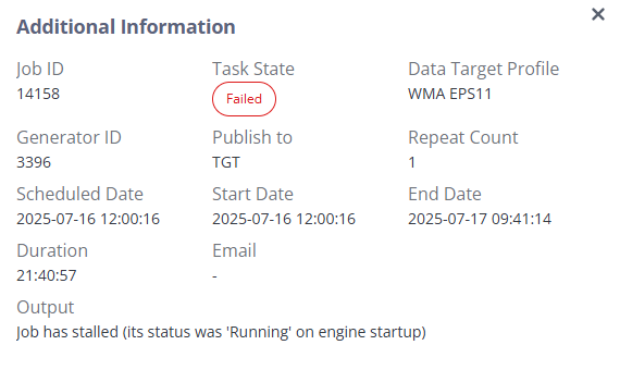 After upgrading from 4.10 to 4.11.2016.0 Portal, Data Generator for one of existing project (Subset from DB to DB) is not running now and failed with the message “Job has stalled (its status was 'Running' on engine startup)” after 12hrs of run without providing any log data.
