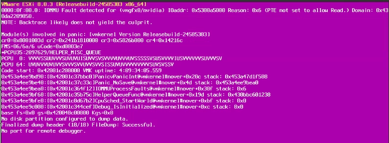 免責事項:これは英文の記事「ESXi PSOD - IOMMU Fault detected for (vmgpX/nvidia) - Reason: 0x6 (PTE not set to allow Read.)」の日本語訳です。記事はベストエフォートで翻訳を進めているため、ローカライズ化コンテンツは最新情報ではない可能性があります。最新情報は英語版の記事で参照してください。