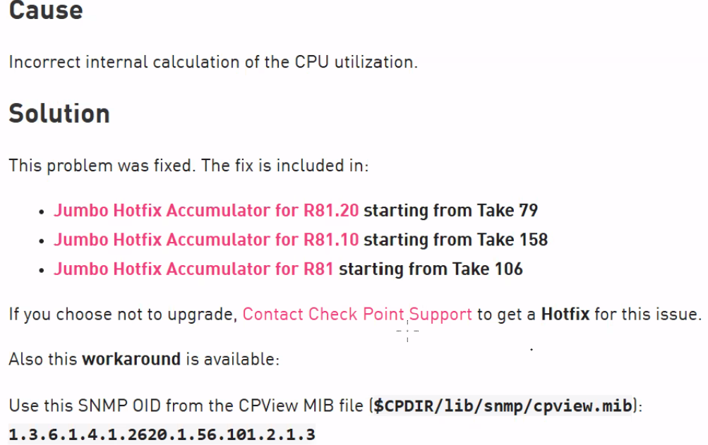 Checkpoint KB: SNMP query for OID 1.3.6.1.4.1.2620.1.6.7.5.1.5 (CPU utilization) may return an incorrect value