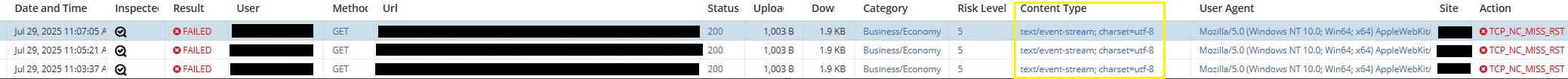 Upon reviewing the proxy logs for the affected site, we observed that the Result shows as FAILED and the Action is TCP_NC_MISS_RST only for requests with the Content-Type "text/event-stream". However, other requests to the same site with different Content-Type show a Result of ALLOWED. Please refer to the following snapshot for more details.