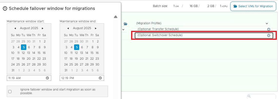 Select the VM and then Update the Switchover schedule (this will show up as the maintenance window details within this view:)