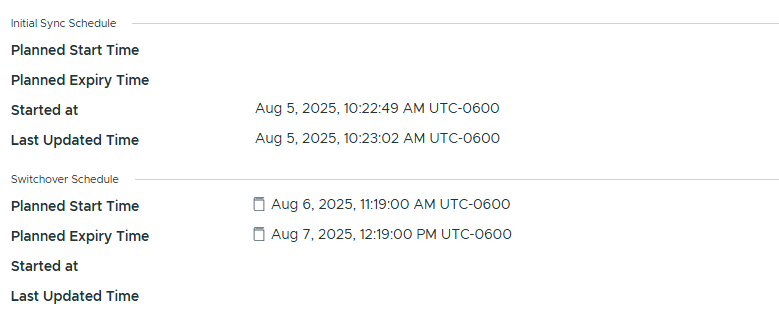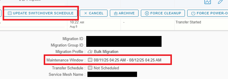 Following an edit to the Switchover Schedule from within the "new" migration view the value on the mobility group changes to be a null value. This may result in VMs beginning switchover prior to expected timeline and potentially resulting in production impact during switchover workflow.