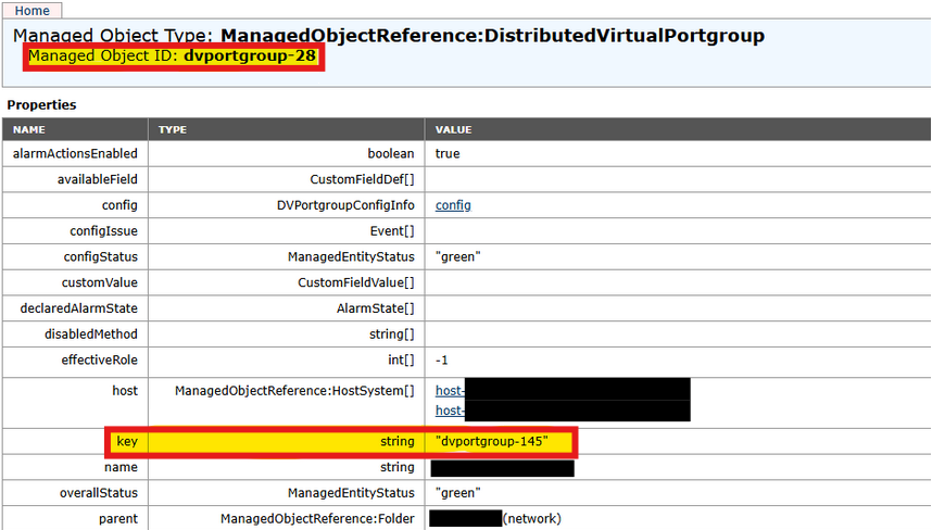 When reviewing a Distributed PortGroup (dvPortGroup) in the Managed Object Browser (MOB) you see the Managed Object ID (MOID) in the page header does not match the "key" property in the object. Exemplified below: