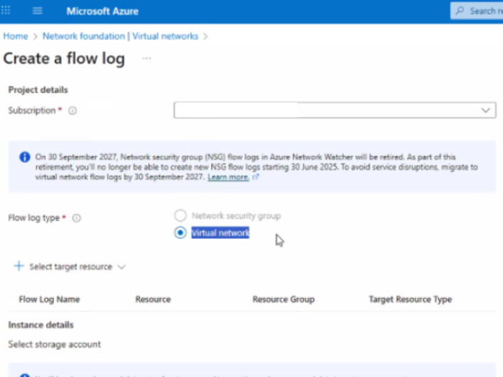When configuring flow logs in Azure as per Enable NSG Flow Log, the Network security group option (required by VCF Operations for Networks) is no longer available and the following alert is displayed: