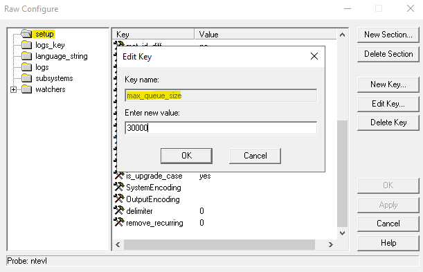 Select NTEVL Raw Configure> select setup section> then edit the max_queue_size