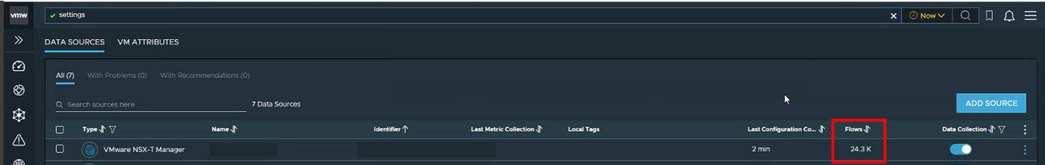 Aria operations for Networks (AON) UI shows no flows on the NSX Data source