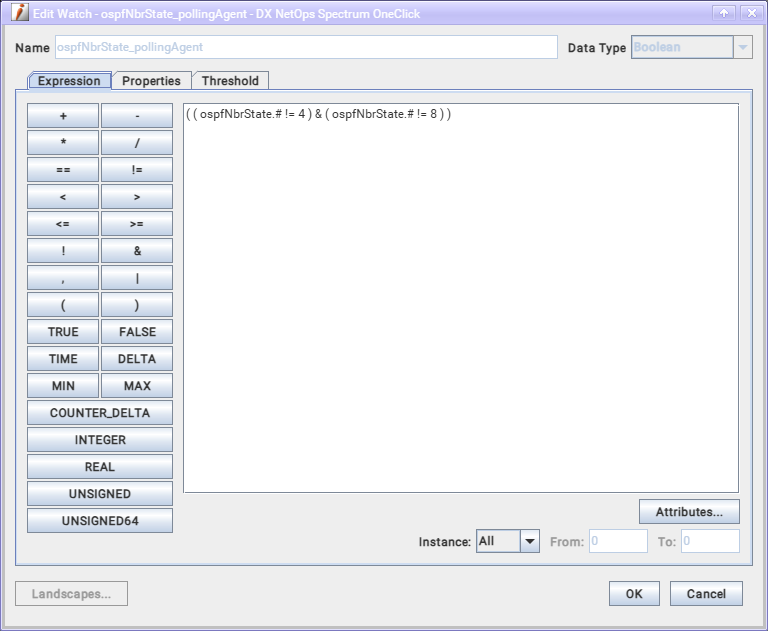 This is real expression: ((ospfNbrState.#!=4)&(ospfNbrState.#!=8))