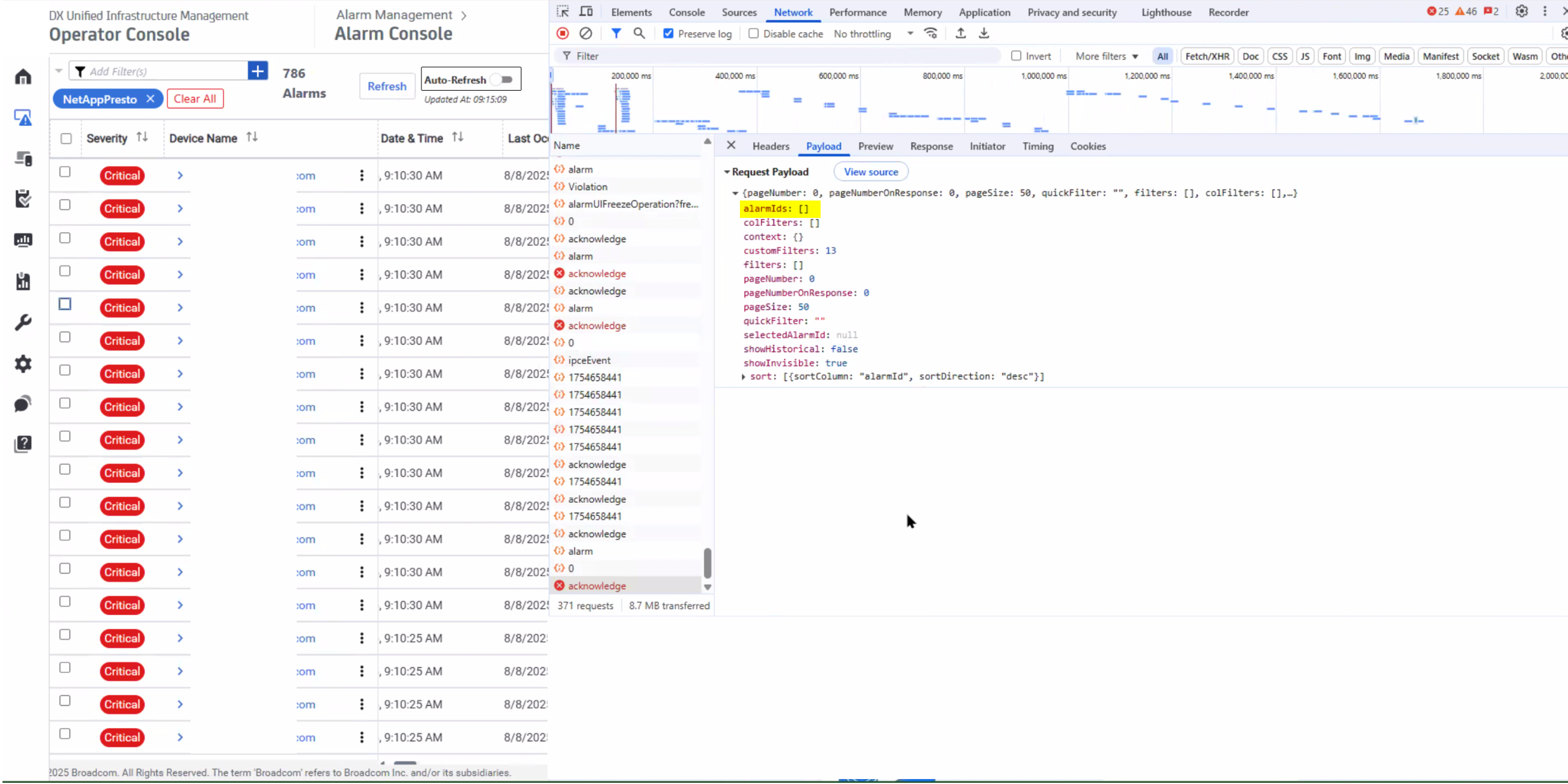 Browser Dev Tools enabled showed no alarm IDs selected nor processed randomly by the alarmviewer api.