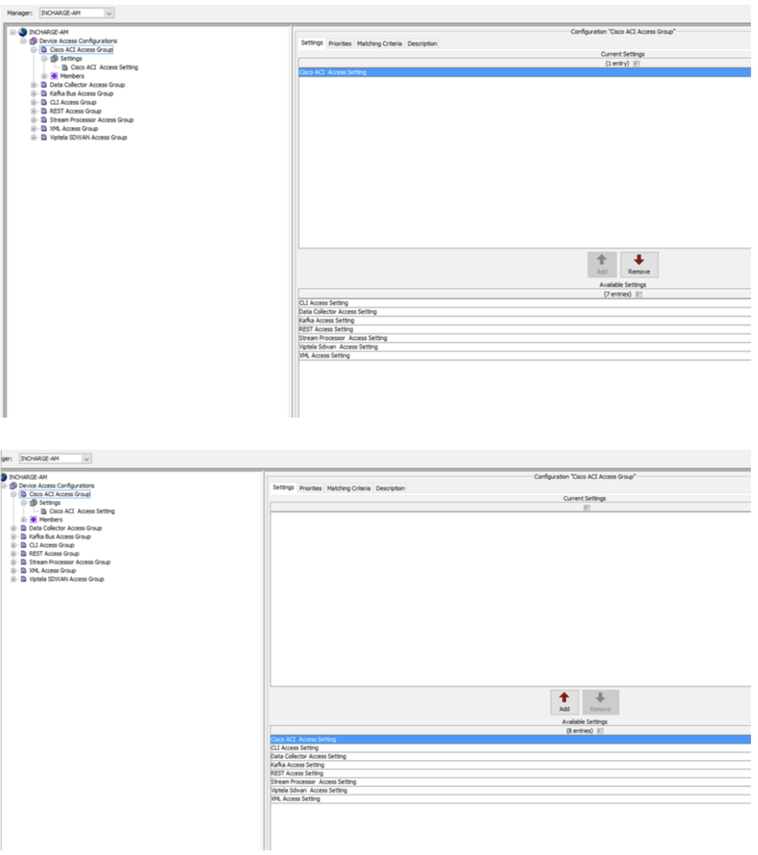 e) If the Cisco ACI settings are configured using the default Cisco ACI Access group, Kafka Bus Access Group and Data Collector Access Group, then “Remove” the Cisco ACI Access Setting, Kafka Access Setting and Data Collector Access Setting from their respective groups and “Add” those settings back. Refer to the screenshot below. This will ensure that all the configured settings are deleted for the respective groups and default settings are restored.