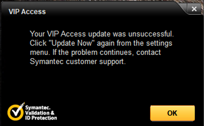 To confirm, click OK to the error, then launch the VIP Access Desktop app. From the menu, click About VIP Access to verify the upgrade was successful.