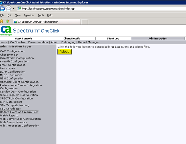 12. From the OneClick Console page select Administration tab and Update Event and Alarm Files and click reload button.