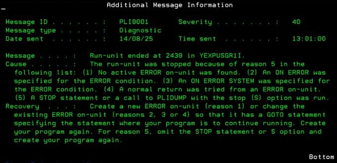 Message: Run-unit ended at 2439 in YEXPUSGR1I