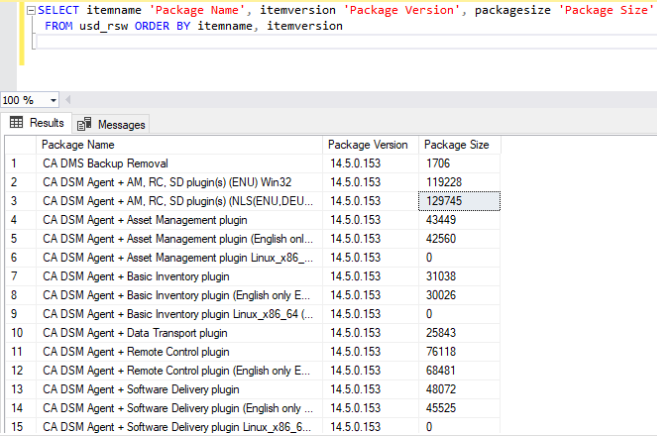 SELECT itemname 'Package Name', itemversion 'Package Version', packagesize 'Package Size'