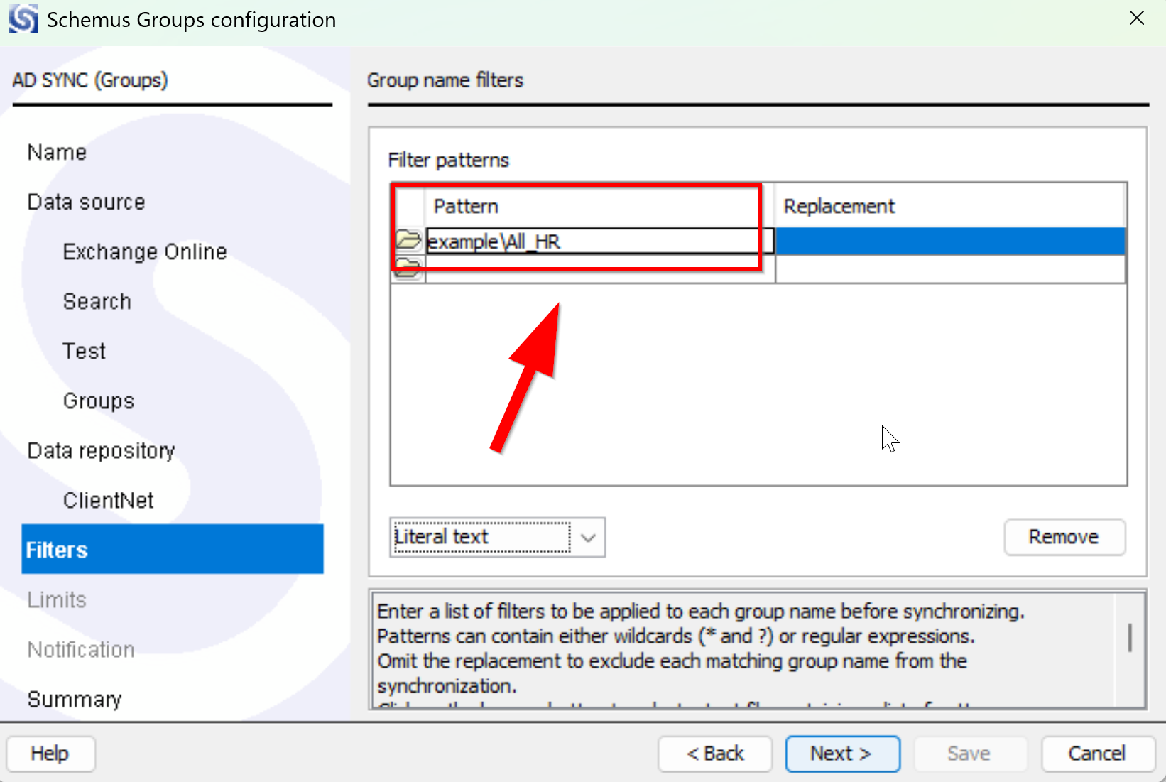 3 - Enter name of the group as displayed in Schemus (usually 'domain\name') in the pattern column