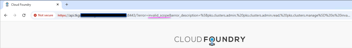 [2025-####.169393Z] uaa - 11 [https-jsse-nio-8443-exec-4] - [db5f####311c1a] .... INFO --- UaaAuthorizationEndpoint: Handling OAuth2 error: error="invalid_scope", error_description="[pks.clusters.admin, pks.clusters.admin.read, pks.clusters.manage] is invalid. This user is not allowed any of the requested scopes"