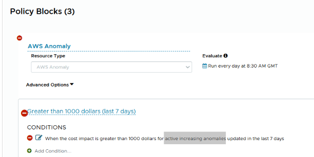 The Anomaly Detection policy may not trigger an alert if the cost change does not meet the threshold defined in the policy condition, even when overall service costs appear to have increased or decreased significantly. Keep in mind that the policy evaluates each anomaly individually (not aggregated anomalies per service), and anomalies are detected based on a combination of service, account, and region.