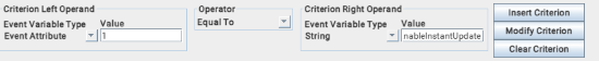 6. Set the rule to Event Attribute 1 Equal To String EnableInstantUpdate and click the Insert Criterion.