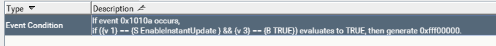 Use an event condition rule on event 0x1010a that searches for Event Attribute 1 Equal To String EnableInstantUpdate and Event Attribute 3 Equal to Boolean True which generates another event that alarms.