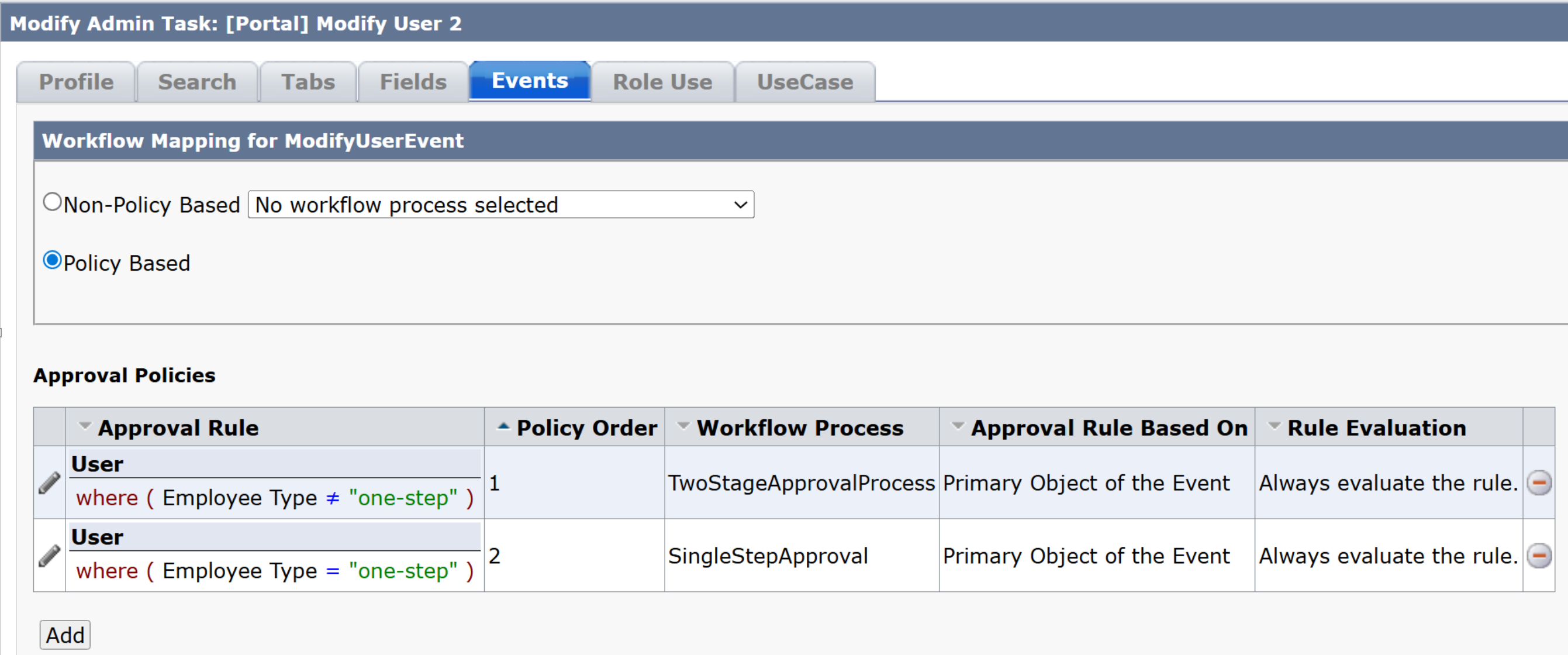 It is advised to use policy based mapping of the ModifyUserEvent (or any other event according to the requirements) to two different workflows: one with single step approval process and another with two stage approval process. See example below: