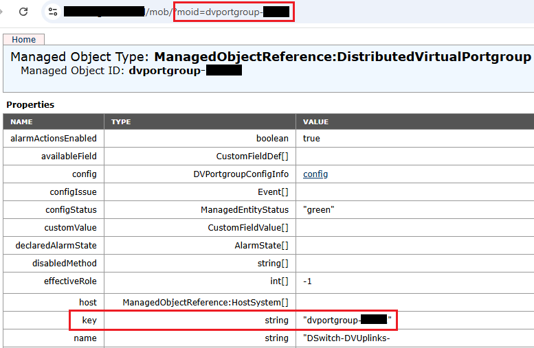https://VC_FQDN/mobcontent-> rootfolder-> childEntity (pick the associated Datacenter)-> networkFolder-> childEntity (pick the DVPG facing the issue)key value and MOID in the URL for the DVPG. Note: A difference between the MOID and portGroupKey value is expected after a network restore in vCenter.
