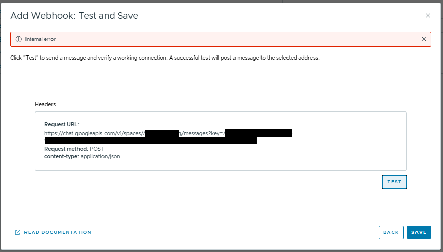 When configuring a Google Chat Webhook integration in CloudHealth, the test step is returning an internal error
